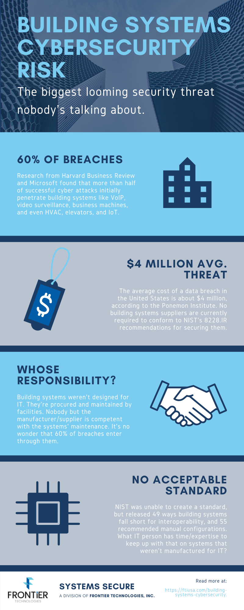 However, these same devices simultaneously present huge cybersecurity risks, that currently aren’t being addressed. Except by hackers, that is, who have exploited these devices to the point where the Harvard Business Review and Microsoft found that 60% of all successful breaches use building systems and IoT as their initial point of penetration.