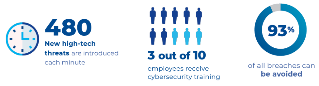 480 new high-tech threats are introduced each minute according to anti-virus provider McAfee, yet cyber security training is provided to only 3 out of 10 employees. Likewise, 6 in 10 small businesses have no digital defense plan in place and 66% believe they are not at risk of an attack.